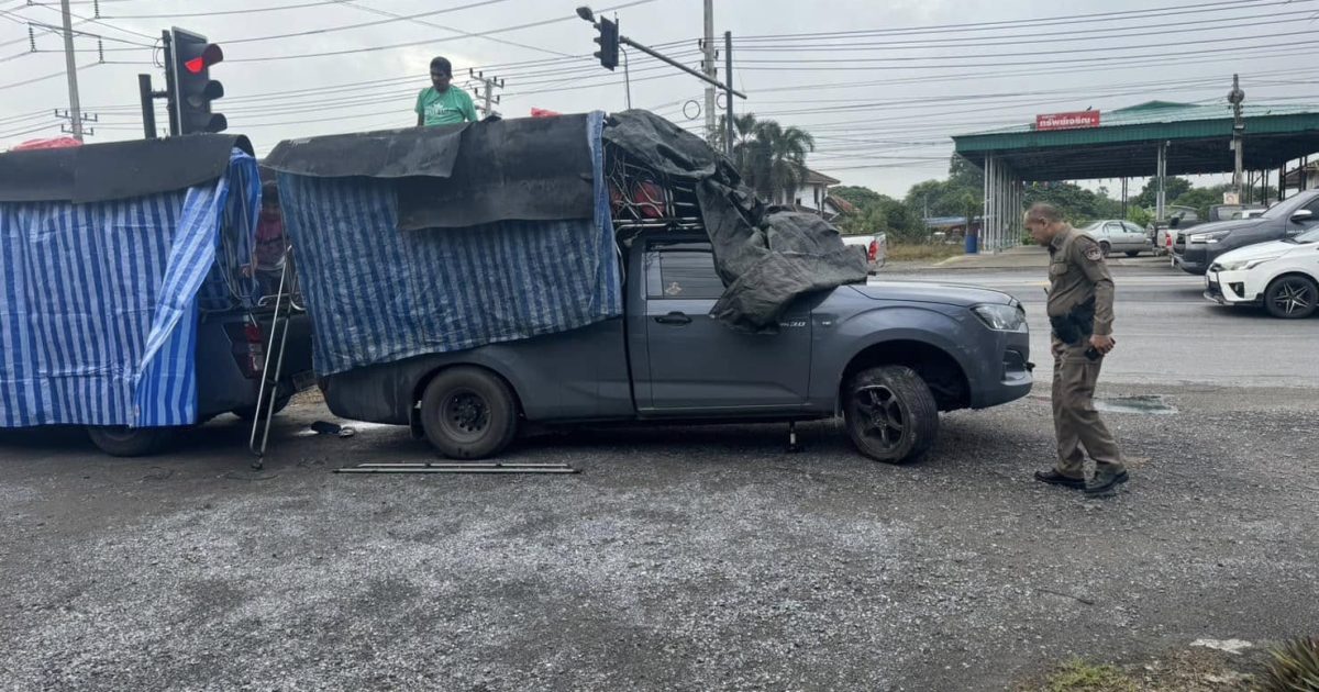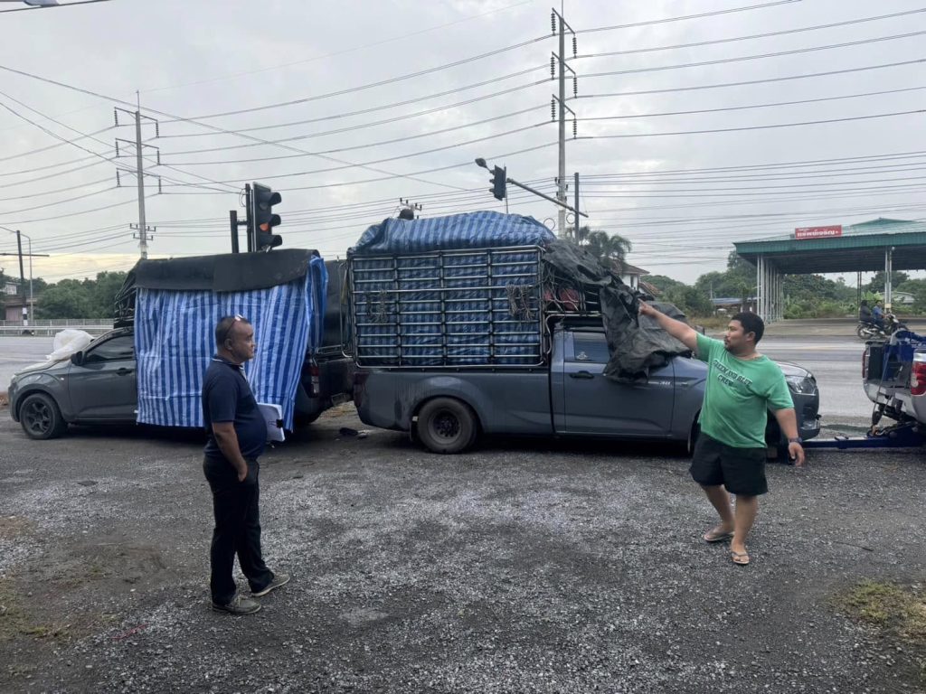 (รถคอก) ขนสินค้าไก่สดแช่แข็งเกิดอุบัติเหตุลูกหมากคันชักล้อหน้าขวาหักได้ประสานรถยกเจ้าของติดต่อทางบริษัทนำรถมาเปลี่ยนถ่ายสินค้าเพื่อสามารถเดินทางต่อไปได้