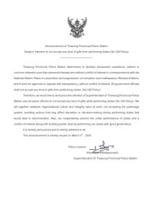 ประชาสัมพันธ์ประกาศเจตนารมณ์ของหน่วยงานในการต่อต้านการทุจริต / การรับสินบน และประกาศเจตจํานงสุจริตในการบริหารงาน ให้แก่ข้าราชการตำรวจ