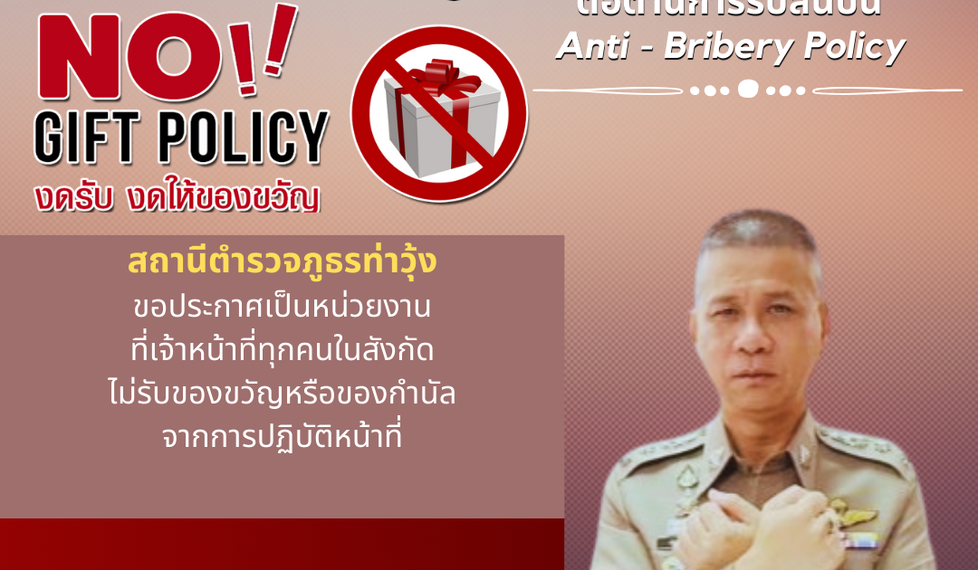 ประกาศสถานีตํารวจภูธรท่าวุ้ง เรื่อง นโยบายต่อต้านการรับสินบน (Anti-Bribery Policy) ประจําปีงบประมาณ พ.ศ. 2568